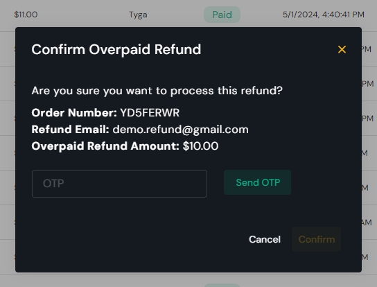 Overpaid Order Refund permissions must be granted at the tenant level. To enable refunds, please contact NovaX support.